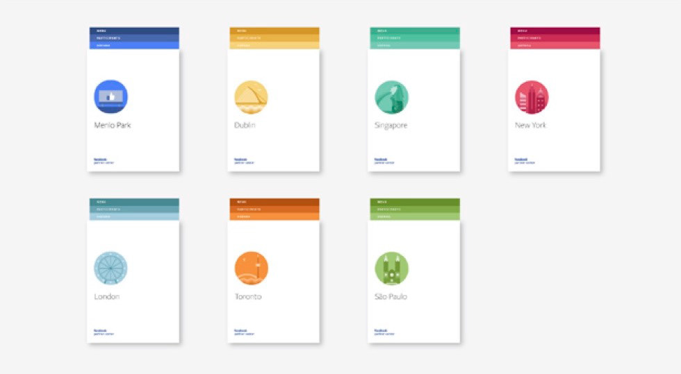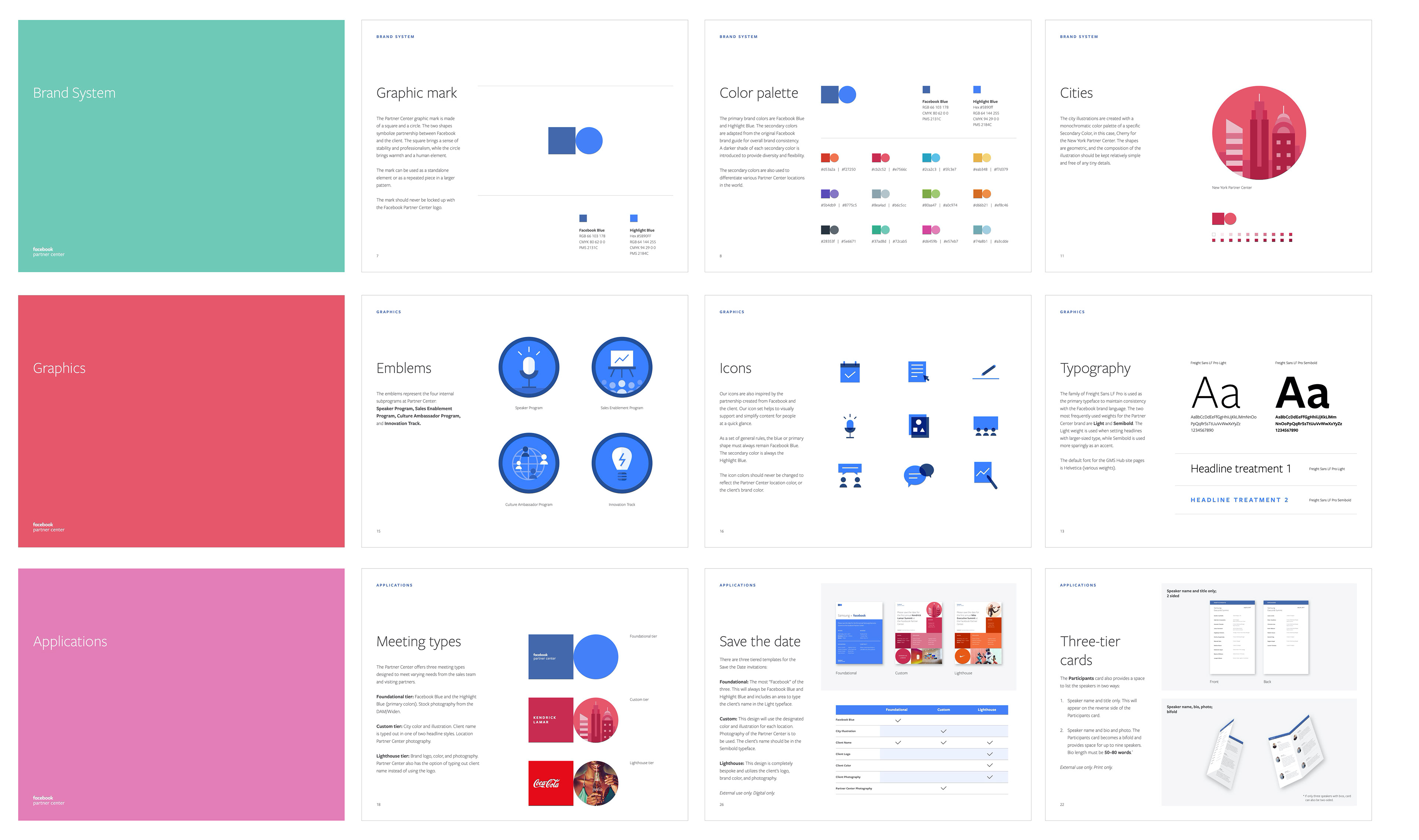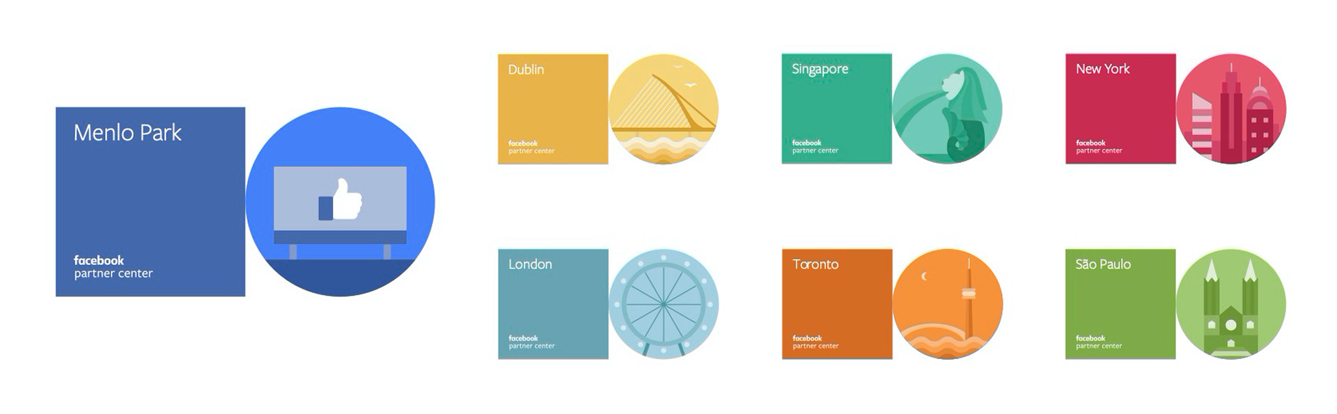 Brand system development with city-specific identities and marketing material design for Facebook's exclusive international meeting spaces.